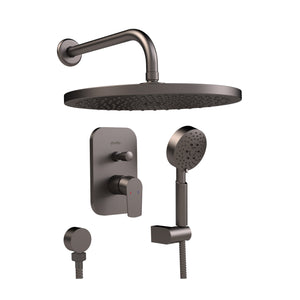INCLUYE Sistema de instalación por unión roscada de 1/2" Hi (Cuerpo). Plato de ducha 30 cm, brazo de ducha 30 cm, salida de agua, soporte móvil, flexible 1,75 mts., maneral 5 funciones.