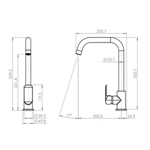 Manilla con giro en 90° que permite mezclar la temperatura del agua.