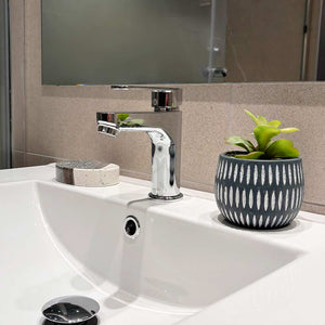Cartucho cerámico con apertura en frío que permite ahorro de energía. La manilla cuenta con giro en 90° que permite regular la temperatura del agua.