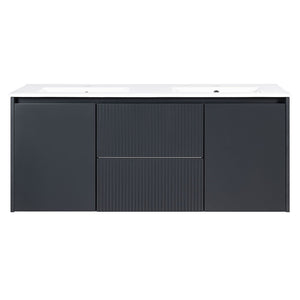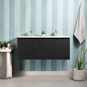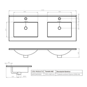 DESCRIPCIÓN Mueble de baño suspendido con dos cajones, dos puertas y cubierta doble vanitorio. Diseño sin manillas. MATERIAL Cuerpo del mueble: MDF enchapado con Melamina. Cajones: enchapados en PVC. Puertas: enchapadas en Melamina. ESPESOR Cuerpo de mueble: 16 mm. RESISTENCIA 45 kg Carga máxima. INCLUYE: Cubierta doble de vanitorio con rebalse. Set de instalación para muro. Desagüe Vanitorio Cromado Pop UP 1 1/4" con rebalse. Sifón Lavamanos PP 1 1/4'' con salida recta.