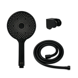 FUNCIONAMIENTO Juego de Ducha con Maneral de 3 funciones. CONEXIÓN 1/2” HE a flexible. MATERIAL Polimetro de Alta Resistencia (ABS). INCLUYE Maneral 3 funciones, soporte móvil y flexible de 175 cm.